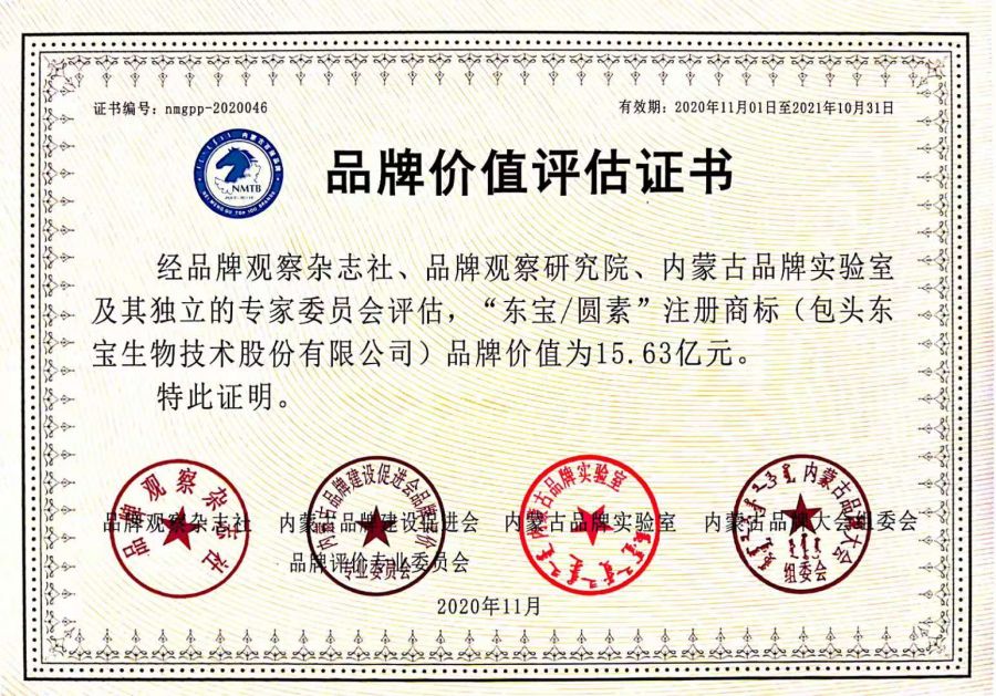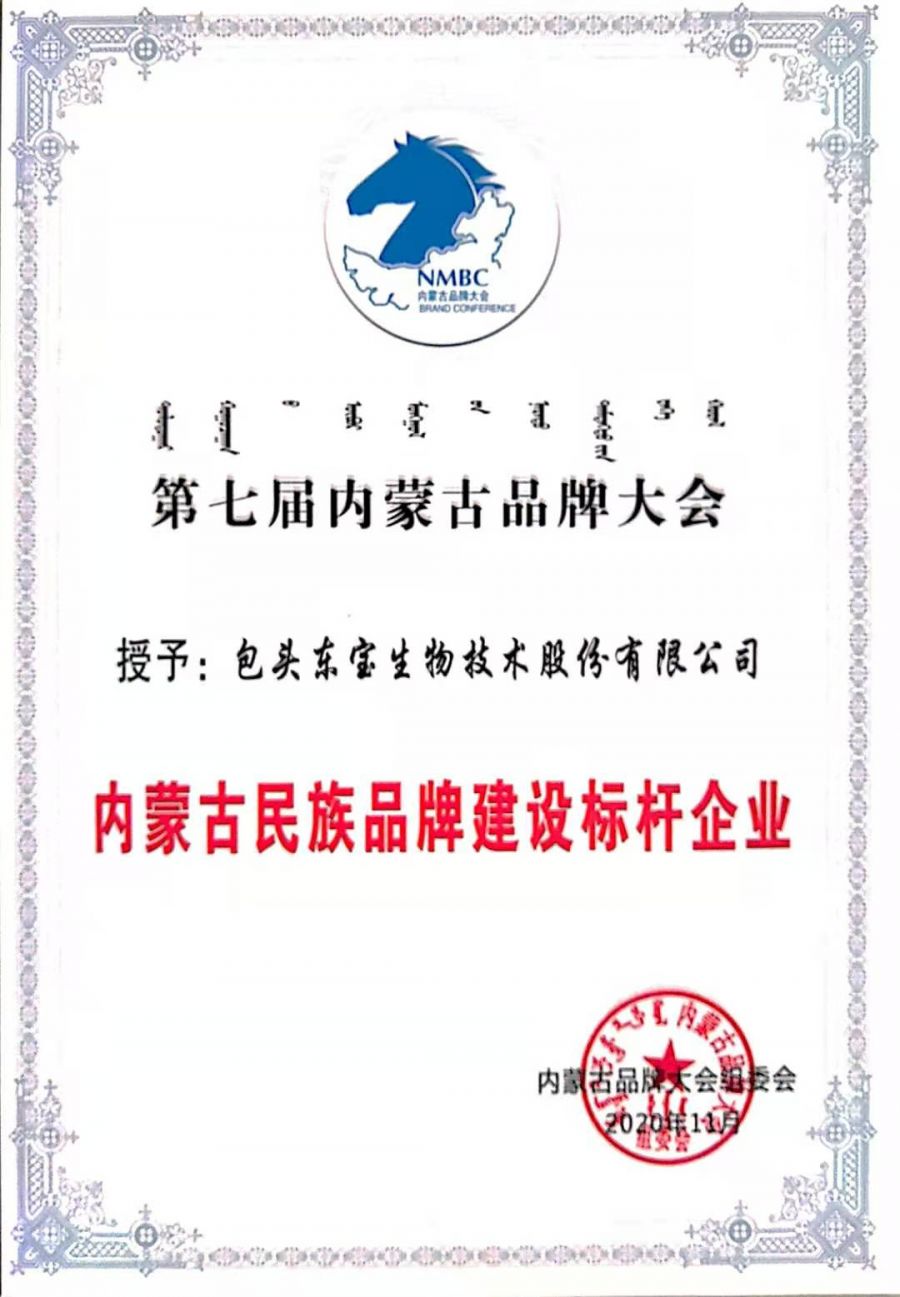 全區(qū)200余家品牌企業(yè)代表及自治區(qū)發(fā)改委、農(nóng)牧廳、工商聯(lián)等單位領(lǐng)導(dǎo)、各大主流媒體記者等300余人參加了大會,會上發(fā)布了“2020年度內(nèi)蒙古品牌價值評價信息數(shù)據(jù)”和“2020年度內(nèi)蒙古百強品牌價值評價分析報告”,并向獲得2020年度內(nèi)蒙古百強(優(yōu)秀、入圍)品牌企業(yè)代表頒發(fā)牌匾、證書。東寶生物分別榮獲《內(nèi)蒙古百強品牌》和《內(nèi)蒙古民族品牌標(biāo)桿企業(yè)》榮譽稱號。